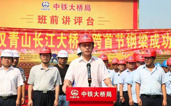 2018年8月8日上午,武漢青山長江大橋主跨鋼梁首架儀式在武昌岸現(xiàn)場舉行。中鐵大橋局副總經(jīng)理張春新出席活動并致詞,武漢交投總經(jīng)理陳順平出席儀式并宣布大橋主跨首節(jié)鋼梁架設(shè)成功,中鐵大橋院副總經(jīng)理莊勇出席了活動。